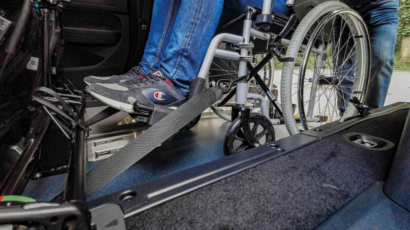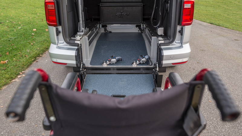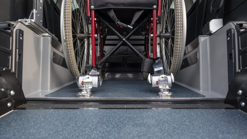 Bei einer Rollstuhlbeförderung wird die faltbare Aluminium-Rollstuhlrampe ausgeklappt und der Rollstuhlfahrer kann bequem im hinteren Teil des Fahrzeugs hineingeschoben werden. Für den sicheren Transport der gehandicapten Person ist ein Rollstuhl-Rückhaltesystem im Innenbereich angebracht. Die im vorderen Bodenbereich versenkbaren elektrischen Sicherheitsgurte ermöglichen das Sichern des Rollstuhls schon außerhalb des Fahrzeugs. Durch den abgesenkten Boden in Verbindung mit der faltbaren Aluminiumrampe im hinteren Teil des Fahrzeugs kann die Innenraumhöhe für den Transport eines Rollstuhlfahrers auf ca. 1440 mm vergrößert werden.